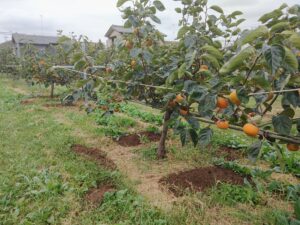 甘秋柿は、低樹高栽培で低いところに柿がなっています。